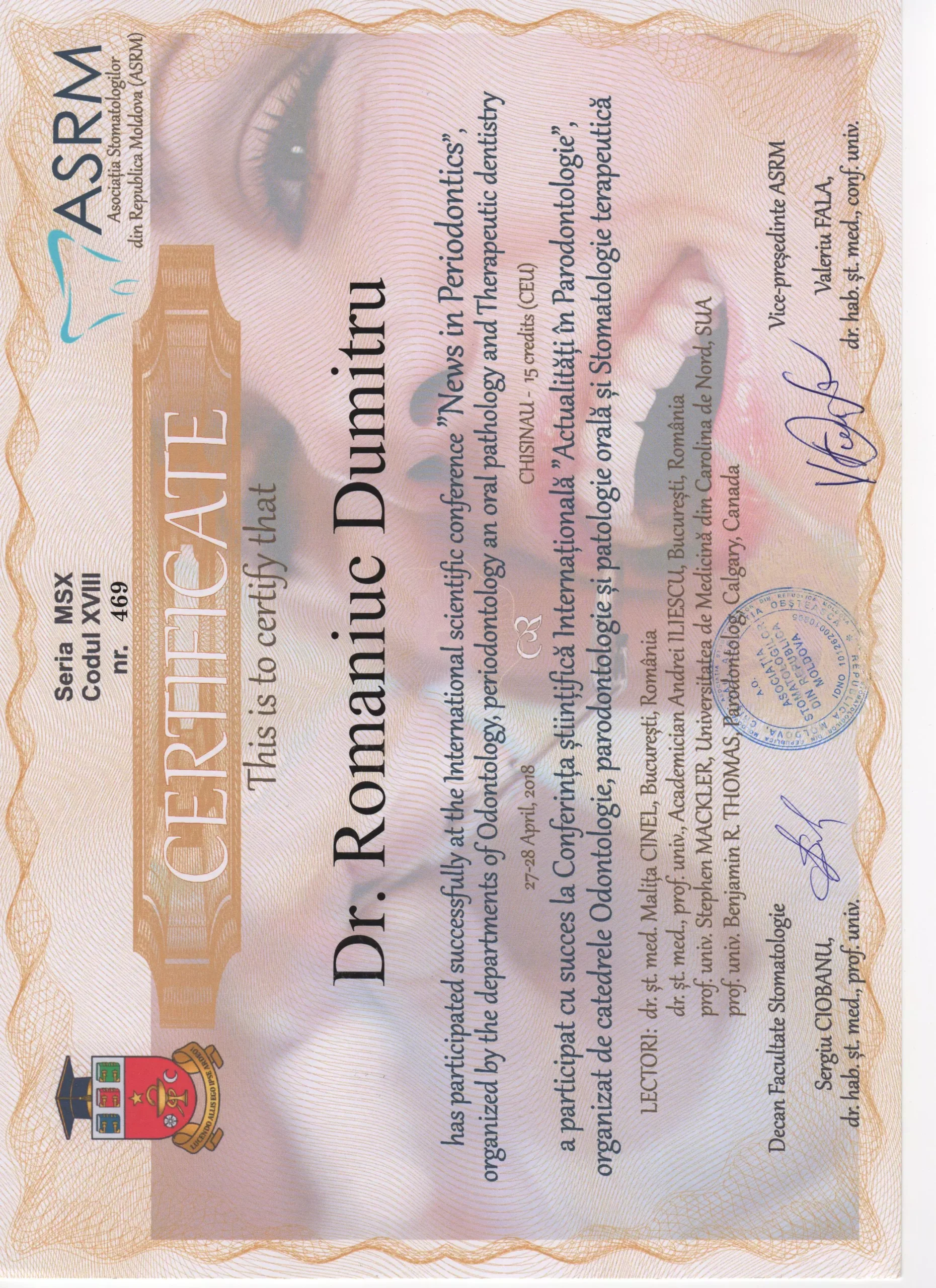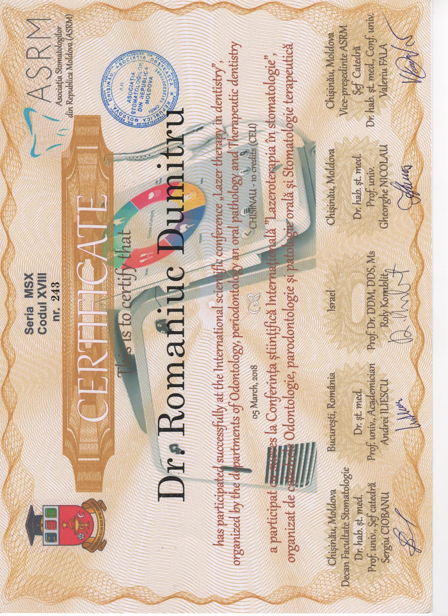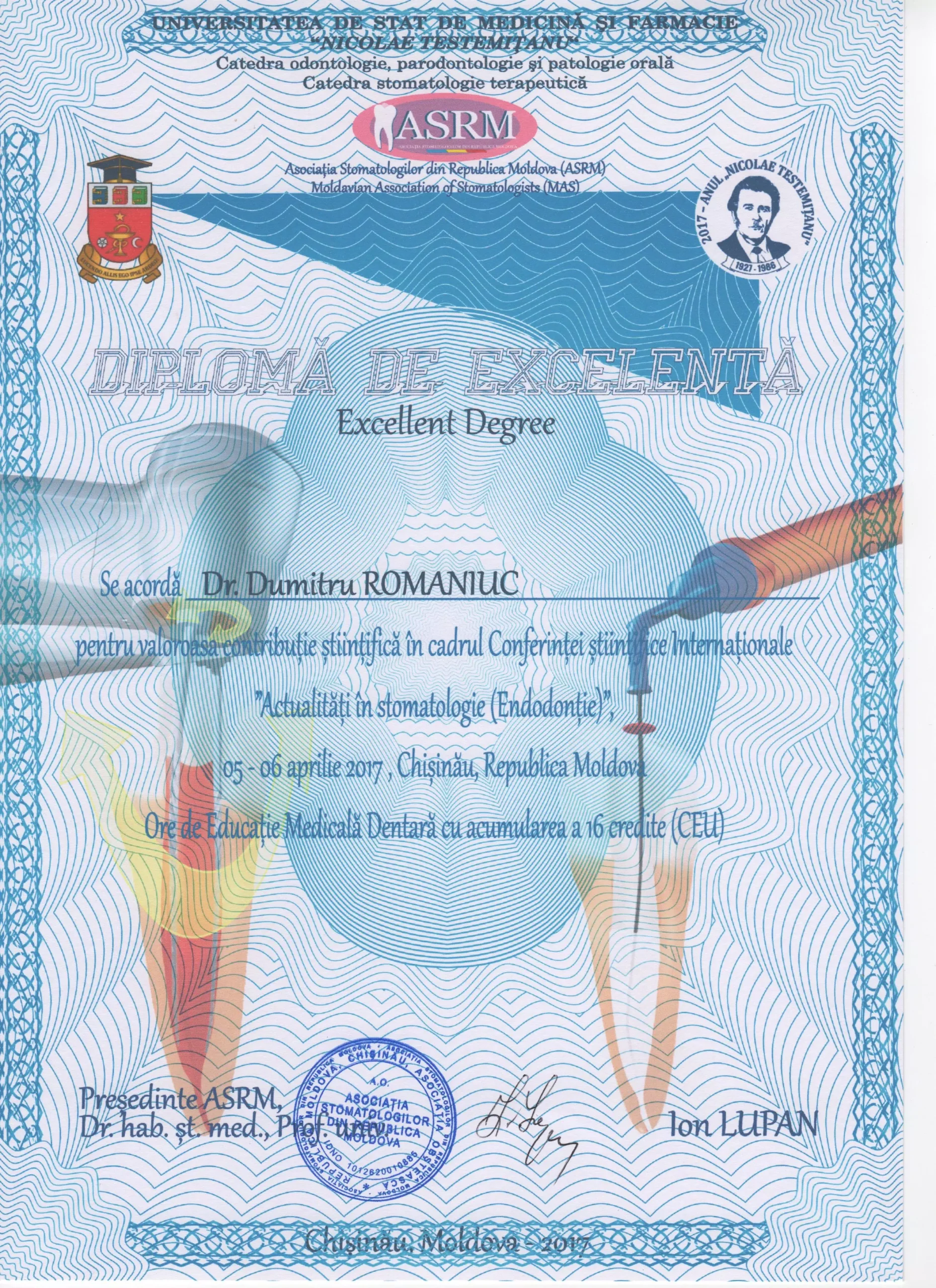 Mulțumiri speciale dr.Dumitru Romaniuc pentru săptămâni de tratamente de restaurare dentară extinse și provocatoare, de profesionalismul si răbdarea de care a dat dovada pe parcursul la o luna de eforturi, m-a ajutat sa vin cu drag la cabinet,mi-a explicat fiecare pas, fiecare proces, s-a asigurat ca sunt bine si mulțumită , punând accent pe calitate, nu doar pe eficientă. Un real succes prin tot ce a reușit sa realizeze, ajutându-ma pe viitor sa zimbesc mai des și sa ma mândresc cu dinții mei...sa depășesc fobia pe care o aveam fata de cabinetele stomatologice, deoarece am schimbat in jur la 4-5 Cabinete pina a ajunge la clinica Dr. Romaniuc , la sigur ma opresc aici și cu siguranța voi reveni periodic și nu doar eu dar toată familia și mulți alți pentru ca voi recomanda cu încredere și multă caldura clinica data 🙏 sunteți super-mega tari 💪 succese pe viitor și cîți mai mulți clienți multumiți, Fericiți , imipliniti ca mine 😅